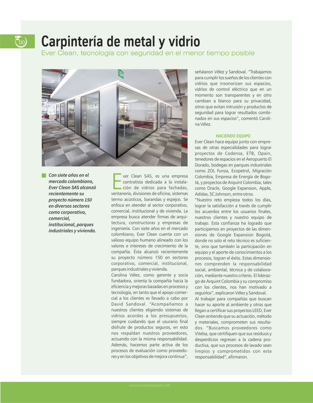 Ever Clean S.A.S. nace en el año 2009, con sus 10 años de actividad hemos realizado más de 200 obras, especializadas en la industria del vidrio como fachadas comerciales, divisiones de oficina, divisiones de baño, puertas en vidrio, tableros, ventanería comercial, residencial, bodegas y marquesinas entre otros.
